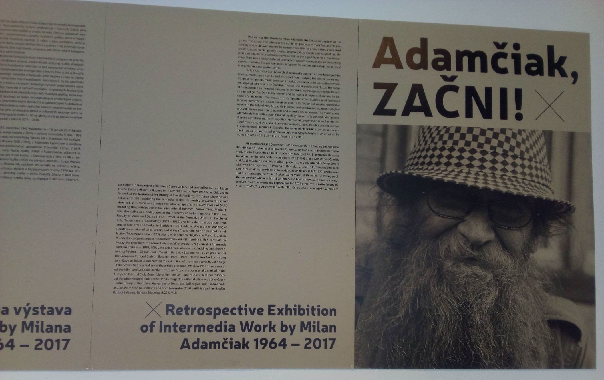 Výstava s názvom – Adamčiak, začni! približuje nekonvenčnú osobnosť Milana Adamčiaka a jeho tvorbu od roku 1964 až po rok 2017. Adamčiak, ako konceptuálny umelec, bol pestrou škálou netradičnosti. Jeho výstava je len dôkazom jeho originality, o ktorú svet prišiel v januári minulého roku.